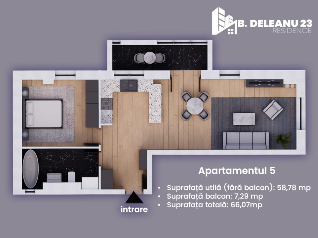 Apartamentul 5 este un apartament cu 2 camere, situat la etajul II, compartimentat eficient, cu o suprafață utilă de 58,78 mp și balcon de 7,29 mp. Livingul generos oferă o zonă de zi luminoasă, separată de bucătăria funcțională. Dormitorul are dimensiuni confortabile, iar baia este bine proporționată.