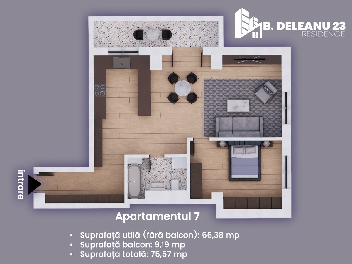 Apartamentul 7 este un apartament cu 2 camere, compartimentat, situat la etajul II, având o suprafață utilă de 66,38mp și balcon de 9,19 mp. Livingul spațios creează o zonă de zi aerisită, separată de bucătăria bine dimensionată. Dormitorul oferă confort și intimitate, iar baia este eficient organizată.