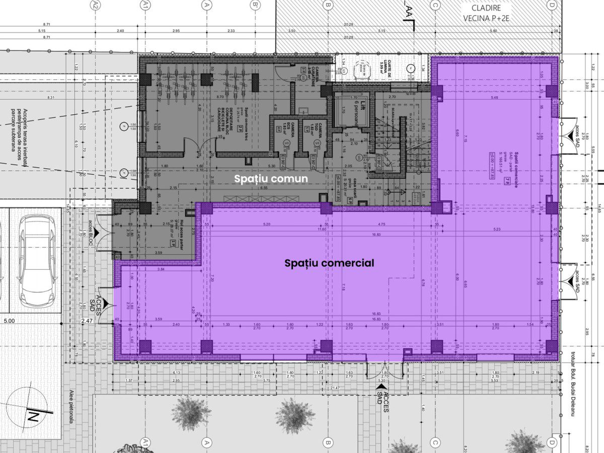 - Spații anexe la parter: Camere tehnice, depozitare comună, TGD, ECS (comune clădirii)